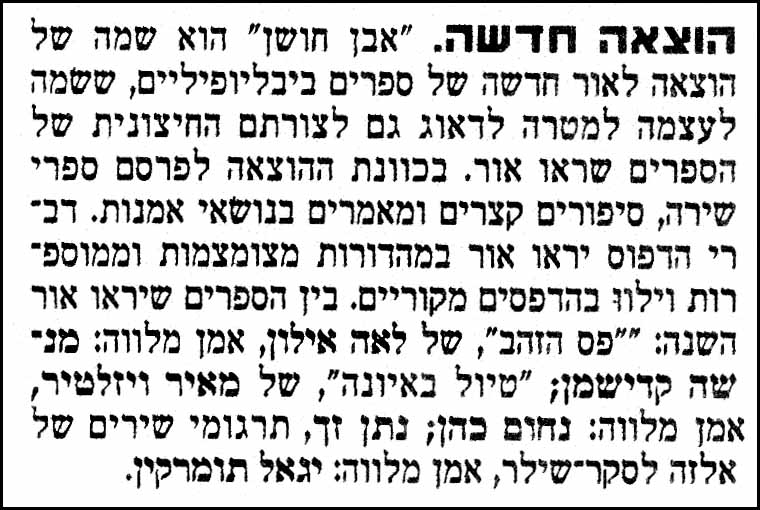 הוצאה חדשה מעריב / ספרות וספרים / יום ו' י"א בשבט תשנ"ו 2.2.96 "אבן חושן" הוא שמה של הוצאה לאור חדשה של ספרים ביבליופיליים, ששמה לעצמה למטרה לדאוג גם לצורתם החיצונית של הספרים שראו אור. בכוונת ההוצאה לפרסם ספרי שירה, סיפורים קצרים ומאמרים בנושאי אמנות. דברי הדפוס יראו אור במהדורות מצומצמות וממוספרות וילוו בהדפסים מקוריים. בין הספרים שיראו אור השנה: "פס הזהב", של לאה אילון, אמן מלווה: מנשה קדישמן: "טיול באיונה", של מאיר ויזלטיר, אמן מלווה: נחום כהן: נתן זך, תרגומי שירים של אלזה לסקר-שילר, אמן מלווה: יגאל תומרקין.