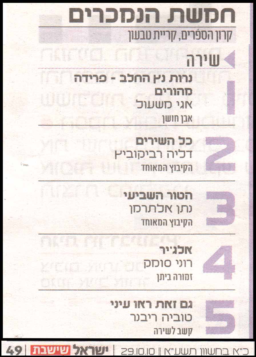 רשימת רבי המכר לשירה במוסף ספרים של 'ישראל היום' מתאריך 29.10.10
